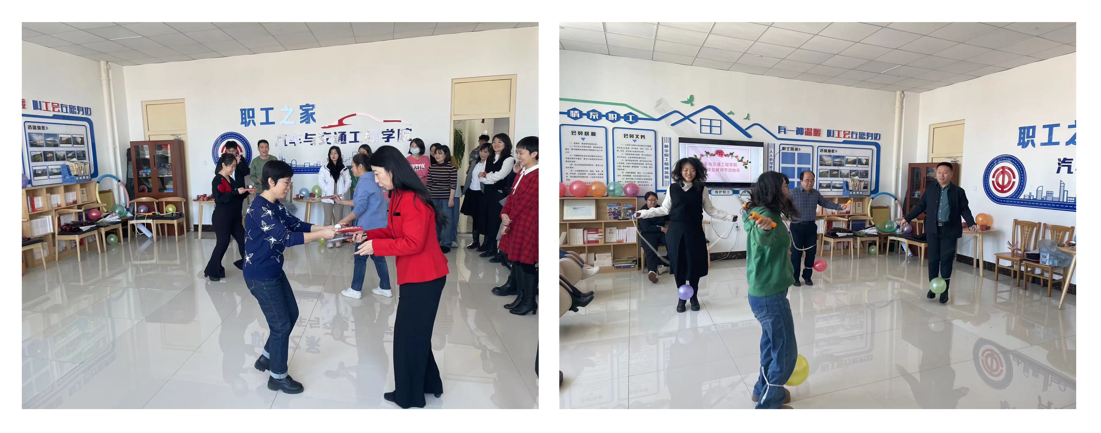 汽车与交通工程学院于2024年3月6日中午,在至善楼1206室开展凝心聚力、共庆国际三八妇女节主题活动。参加活动的有汽车与交通工程学院所有领导、女教师和部分男教师。 此次活动通过开展团队游戏的形式进行,设置了多种趣味盎然的游戏,包括乒乓球接力、护球跳绳和你猜我踢等。活动过程中女教师积极参与、热情高涨,同时激发了男教师的关注和互动热情,真正实现了广泛参与、凝心聚力。