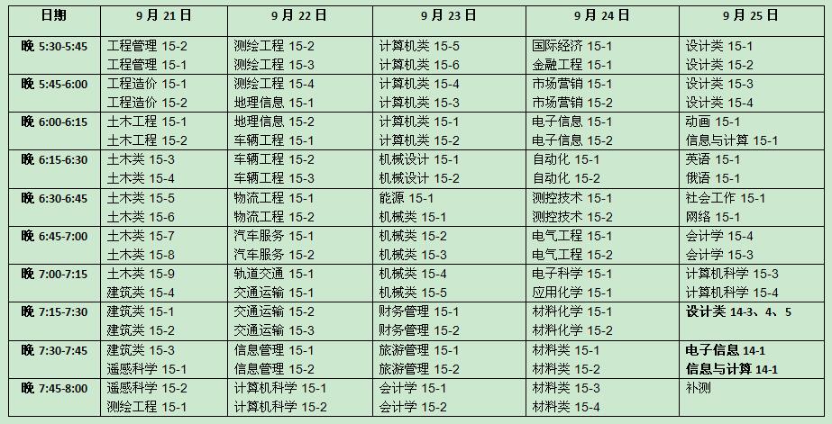 2015级学生测试时间见附表1。测试学生携带校园卡提前10分钟到达测试场地,进行测试前准备活动。