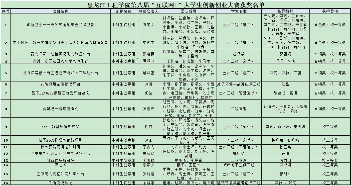 第八届中国国际“互联网+”大学生创新创业大赛黑龙江省赛区决赛于2022年7月27日在线上举行。我院再获佳绩,土木工程(建工)专业孙宅文团队的《管道卫士—天然气运输安全的捍卫者》和史泽宇团队的《宇工科技—新一代建设项目全生命周期环境治理领航者》获得了本次省赛的金奖。建筑学专业巢震豪团队的《薪火归家—红色可视化大数据平台》﹑土木工程(道桥)专业黄鹏飞团队的《青树一寒区路面汽车尾气净化者》﹑土木工程(智慧道桥)专业何鉴团队的《基于BIM+GIS智慧工地云平台建构》﹑土木工程(建工)专业解鸿基团队的《瀚海探索者—自主遥控双模式水下移动平台》﹑工程管理专业张世泽团队的《食粲记—精装酸粉机》和建筑环境与能源应用工程专业刘源团队的《安防视频监控管理平台》获得了本次省赛的铜奖。 第八届taptap福彩3D“互联网+”大学生创新创业大赛暨第八届黑龙江省“互联网+”大学生创新创业大赛选拔赛中我院共推荐17支项目团队参与。近日,经学校评委评选,共评选出校一等奖8项,校二等奖3项,校三等奖5项。 通过本次大赛充分展现我院创新创业教育的丰硕成果,全面展示学生敢闯会创、昂扬向上的精神风貌,激励学生在为祖国、为民族、为人民的不懈奋斗中立大志、明大德、成大才、担大任。