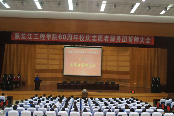 会上,学生工作部部长德国明同志做了动员讲话,他对志愿者提出了两点希望,希望志愿者们树立爱校意识,将爱校情结与做好志愿服务工作有效结合,做好学校成就宣传员;希望志愿者们树立良好的工作态度,作到热情、周到、耐心,形成认真、努力、踏实的工作作风,做好学校形象代言人。随后,举行了校庆60周年志愿者授旗仪式,由团委、各院(系)志愿者工作负责老师为校庆志愿服务总队和志愿服务分队授旗。电气与信息工程学院潘海阳同学代表全体校庆志愿者发言,他号召广大志愿者要汇集每个人的微薄之力,来铸就校庆志愿服务的坚强后盾,并代表志愿者许下承诺。最后,土木与建筑工程学院郭东旭学同学带领全体志愿者宣誓,铿锵有力的誓词代表了所有校庆志愿者的心愿,“我为校庆做贡献,校庆有我更精彩!”
