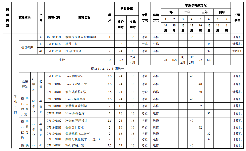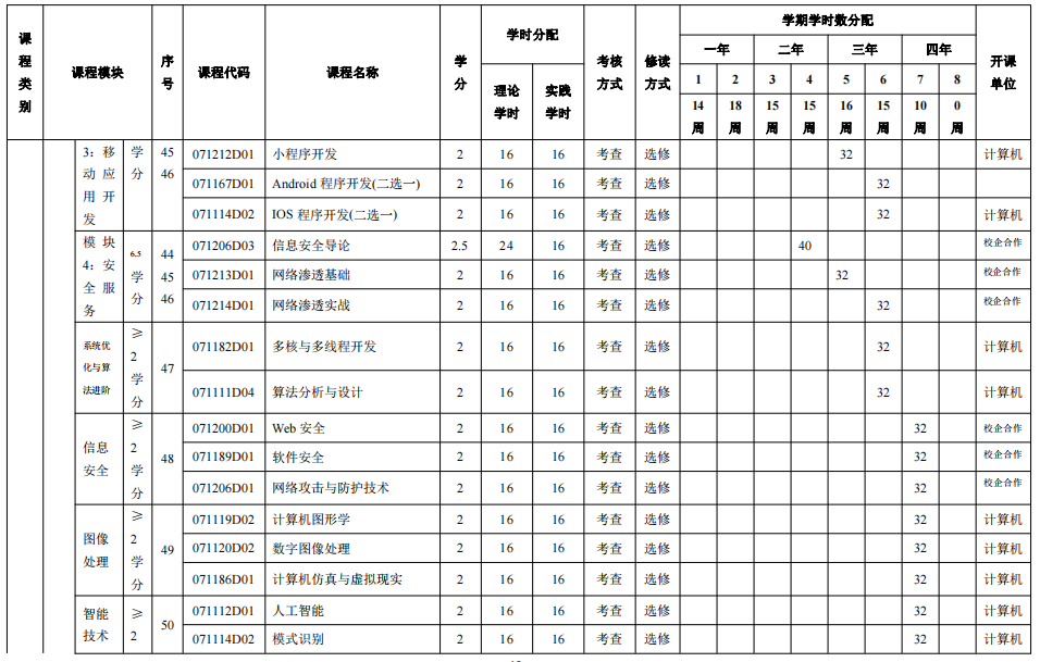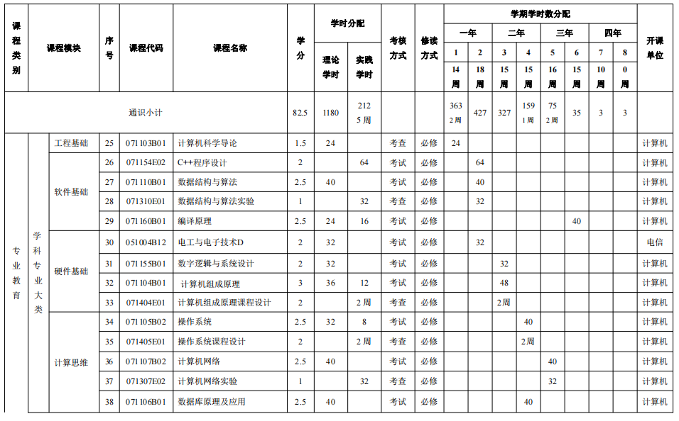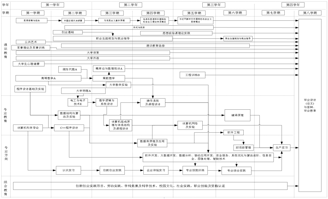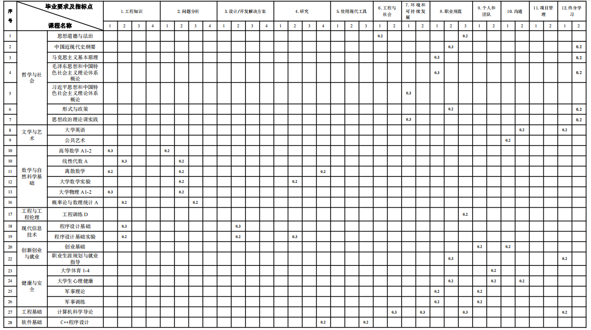 四、专业基本修业年限及修读学分规定 基本修业年限为4 年,最长修业年限为 6 年。本专业要求毕业生必须修满规定的 180学分,其中必修课152 学分、选修课 29.5 学分,完成规定的实践性教学环节 46 学分,成绩合格且毕业设计通过答辩,准予毕业。 五、授予学位 达到《taptap福彩3D普通本科毕业生学士学位授予工作实施细则》规定的毕业生,授予工学学士学位。 六、支撑学科 计算机科学与技术 七、核心课程 离散数学、程序设计基础、数据结构与算法、计算机组成原理、操作系统、计算机网络、数据库原理及应用、软件工程、编译原理。 八、课程与毕业要求的关系矩阵